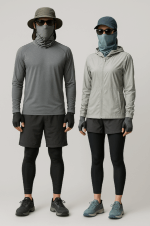 腕や脚をカバーしながらも通気性を確保でき、日焼けを防ぎつつ軽やかに動ける。 - フェイスガード・アームカバー:首元・頬・手の甲まで覆えるタイプを選び、紫外線をブロック。